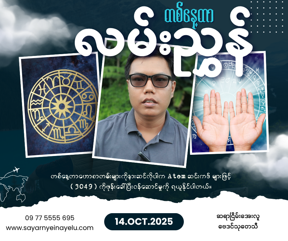 ဒါအပြင်ဆရာငြိမ်းအေးလူနှင့်တိုက်ရိုက်📞ဖုန်းခေါ်ဆိုပြီး ဗေဒင်မေးချင်တယ်ဆိုရင်…အပတ်စဥ် တနင်္လာနေ့၊အင်္ဂါနေ့၊ ဗုဒ္ဓဟူးနေ့ရောက်တိုင်း ညနေ (၆) နာရီကနေ (၈) နာရီအတွင်းဖုန်းနံပါတ် (7777) ကို Atomဖုန်းနံပါတ်များနှင့် ဖုန်းခေါ်ဆိုပြီး မေးမြန်းနိုင်ပါတယ် ခင်ဗျာ… ။ ( တစ်မိနစ်လျှင် ၅၂၅ ကျပ် ၊ ဉာဏ်ပူဇော်ခပါပြီး ကျသင့်ပါမယ်)