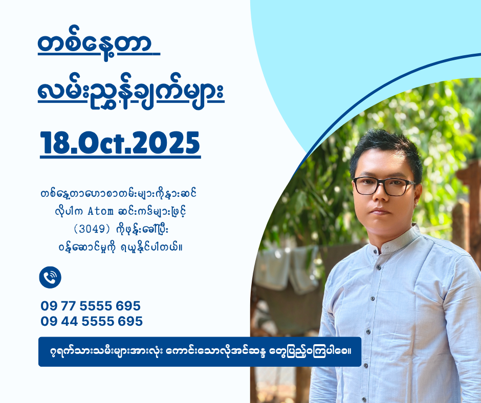 ဒါအပြင်ဆရာငြိမ်းအေးလူနှင့်တိုက်ရိုက်📞ဖုန်းခေါ်ဆိုပြီး ဗေဒင်မေးချင်တယ်ဆိုရင်…အပတ်စဥ် တနင်္လာနေ့၊အင်္ဂါနေ့၊ ဗုဒ္ဓဟူးနေ့ရောက်တိုင်း ညနေ (၆) နာရီကနေ (၈) နာရီအတွင်းဖုန်းနံပါတ် (7777) ကို Atomဖုန်းနံပါတ်များနှင့် ဖုန်းခေါ်ဆိုပြီး မေးမြန်းနိုင်ပါတယ် ခင်ဗျာ… ။ ( တစ်မိနစ်လျှင် ၅၂၅ ကျပ် ၊ ဉာဏ်ပူဇော်ခပါပြီး ကျသင့်ပါမယ်)