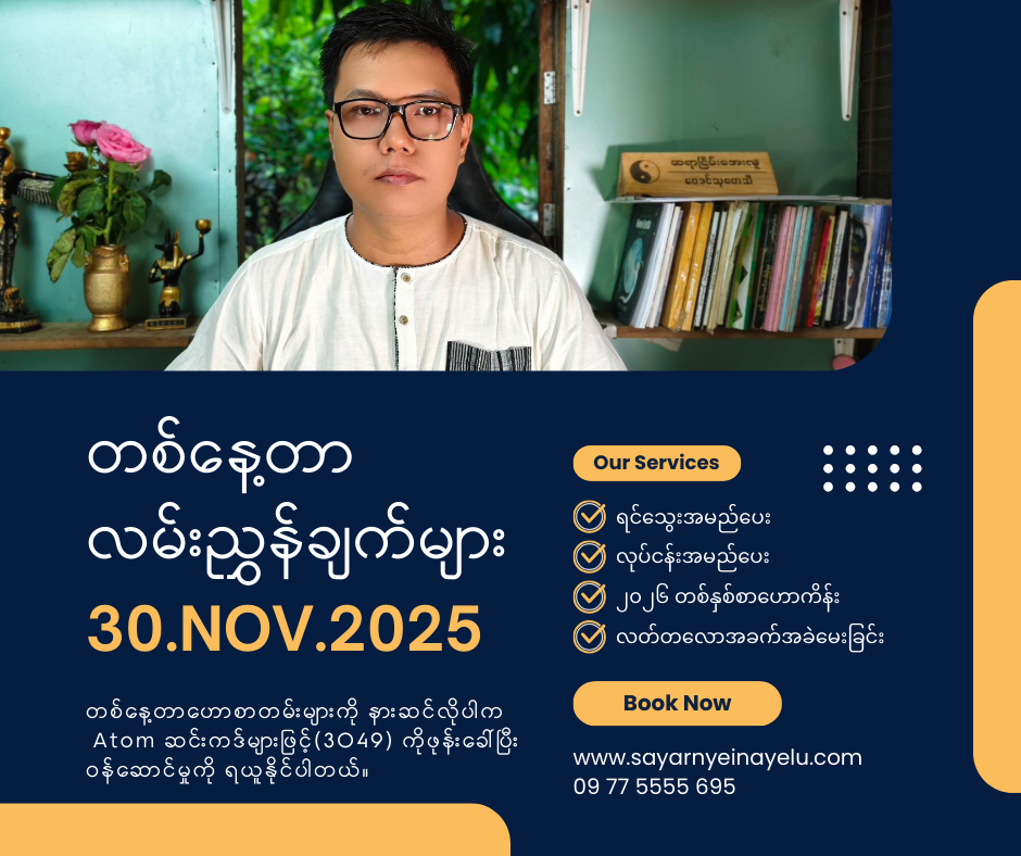 ဒါအပြင်ဆရာငြိမ်းအေးလူနှင့်တိုက်ရိုက်📞ဖုန်းခေါ်ဆိုပြီး ဗေဒင်မေးချင်တယ်ဆိုရင်…အပတ်စဥ် တနင်္လာနေ့၊အင်္ဂါနေ့၊ ဗုဒ္ဓဟူးနေ့ရောက်တိုင်း ညနေ (၆) နာရီကနေ (၈) နာရီအတွင်းဖုန်းနံပါတ် (7777) ကို Atomဖုန်းနံပါတ်များနှင့် ဖုန်းခေါ်ဆိုပြီး မေးမြန်းနိုင်ပါတယ် ခင်ဗျာ… ။ ( တစ်မိနစ်လျှင် ၅၂၅ ကျပ် ၊ ဉာဏ်ပူဇော်ခပါပြီး ကျသင့်ပါမယ်)