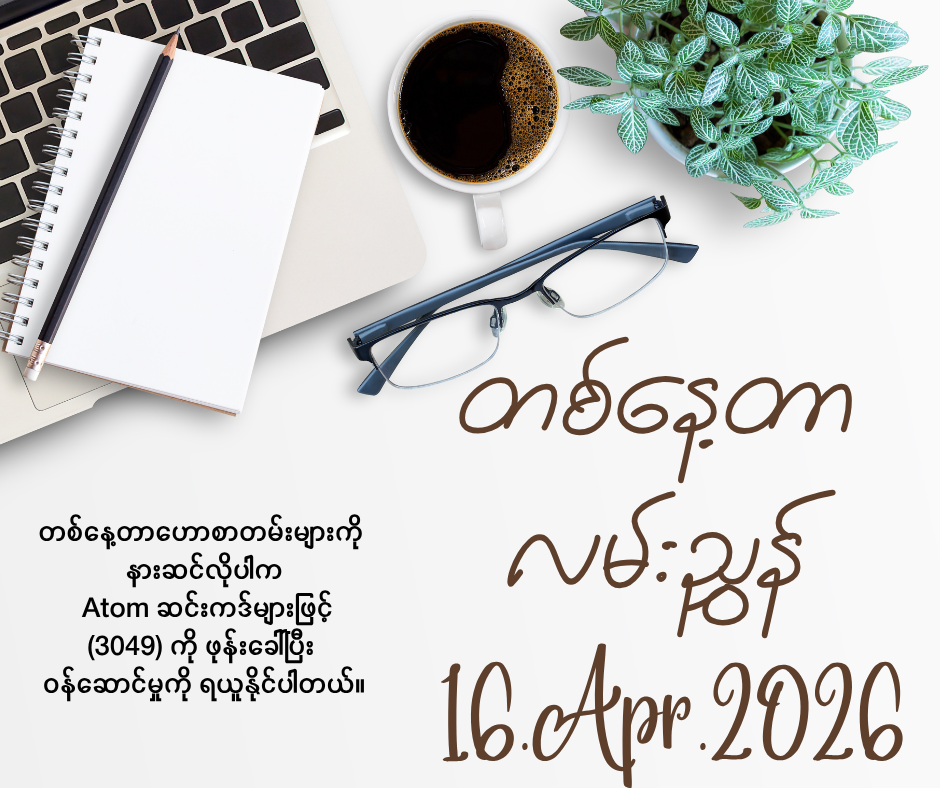 ATOM ဆင်းကဒ်များဖြင့် (3049) ကို ဖုန်းခေါ်ဆိုပြီး နားဆင်နိုင်ပါတယ်…။ ( တစ်ပတ်လျှင် ၄၅၀ ကျပ်သာကျသင့် မှာဖြစ်ပါတယ်။)