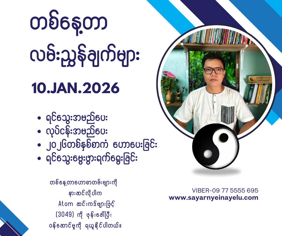 ဒါအပြင်ဆရာငြိမ်းအေးလူနှင့်တိုက်ရိုက်📞ဖုန်းခေါ်ဆိုပြီး ဗေဒင်မေးချင်တယ်ဆိုရင်…အပတ်စဥ် တနင်္လာနေ့၊အင်္ဂါနေ့၊ ဗုဒ္ဓဟူးနေ့ရောက်တိုင်း ညနေ (၆) နာရီကနေ (၈) နာရီအတွင်းဖုန်းနံပါတ် (7777) ကို Atomဖုန်းနံပါတ်များနှင့် ဖုန်းခေါ်ဆိုပြီး မေးမြန်းနိုင်ပါတယ် ခင်ဗျာ… ။ ( တစ်မိနစ်လျှင် ၅၂၅ ကျပ် ၊ ဉာဏ်ပူဇော်ခပါပြီး ကျသင့်ပါမယ်)