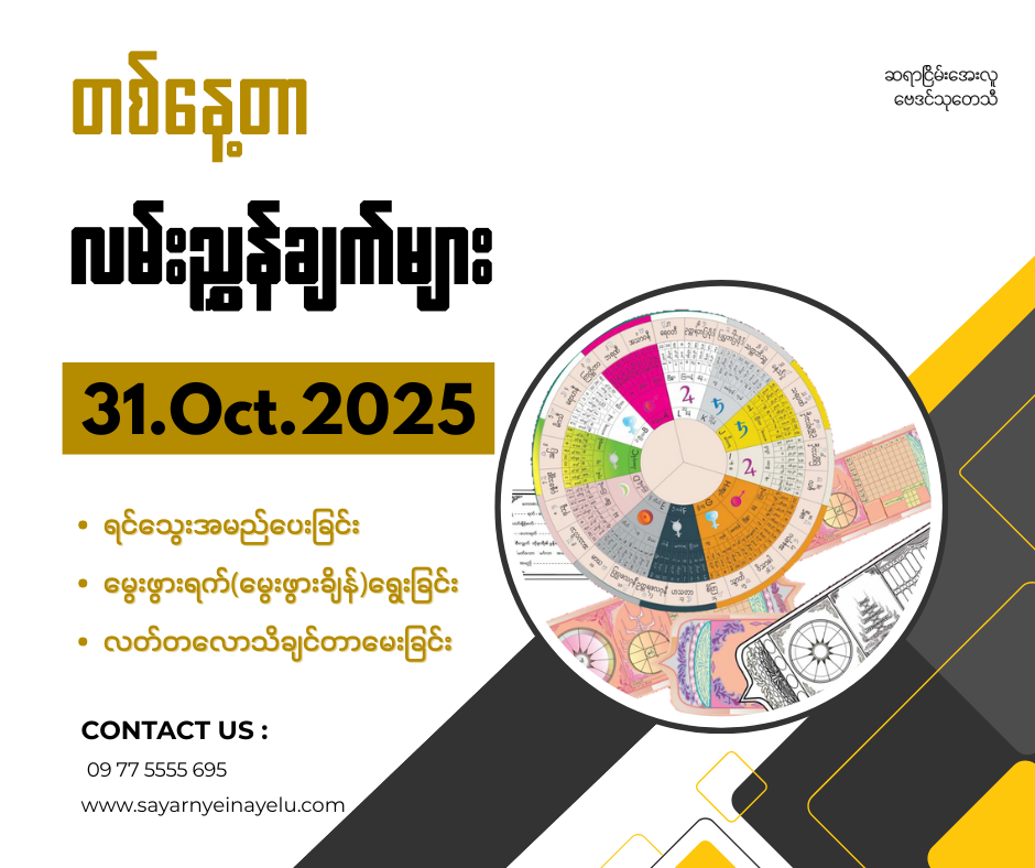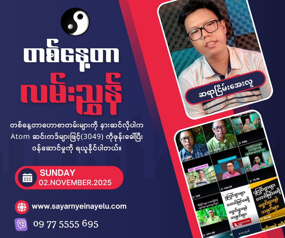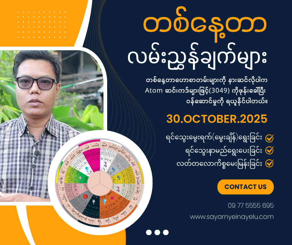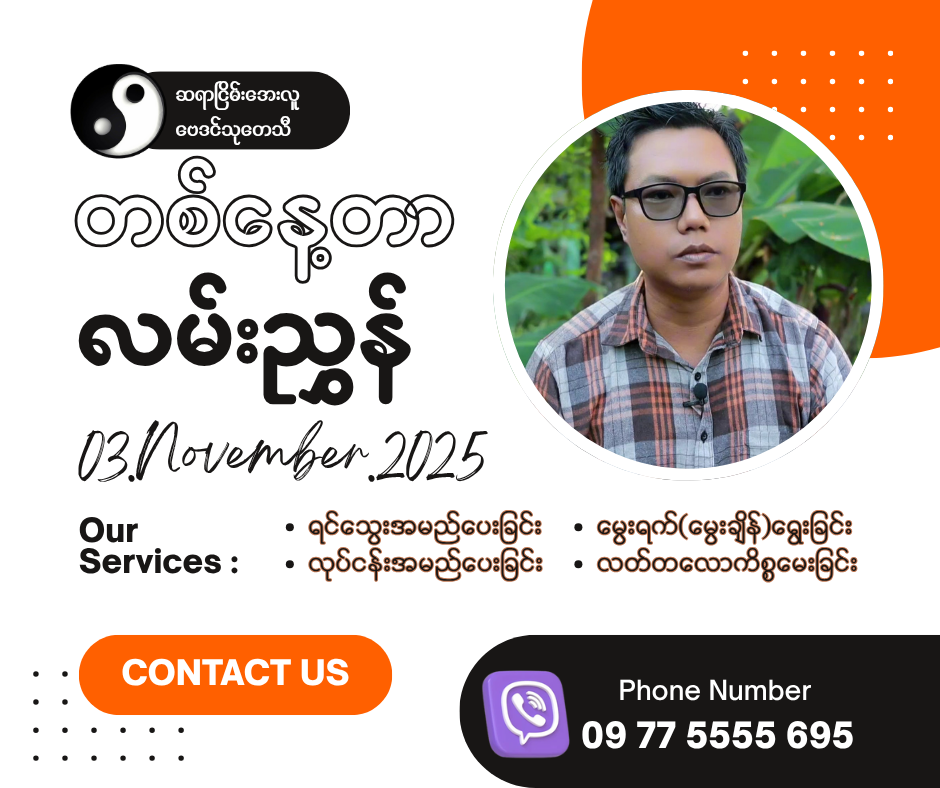 ဒါအပြင်ဆရာငြိမ်းအေးလူနှင့်တိုက်ရိုက်📞ဖုန်းခေါ်ဆိုပြီး ဗေဒင်မေးချင်တယ်ဆိုရင်…အပတ်စဥ် တနင်္လာနေ့၊အင်္ဂါနေ့၊ ဗုဒ္ဓဟူးနေ့ရောက်တိုင်း ညနေ (၆) နာရီကနေ (၈) နာရီအတွင်းဖုန်းနံပါတ် (7777) ကို Atomဖုန်းနံပါတ်များနှင့် ဖုန်းခေါ်ဆိုပြီး မေးမြန်းနိုင်ပါတယ် ခင်ဗျာ… ။ ( တစ်မိနစ်လျှင် ၅၂၅ ကျပ် ၊ ဉာဏ်ပူဇော်ခပါပြီး ကျသင့်ပါမယ်)