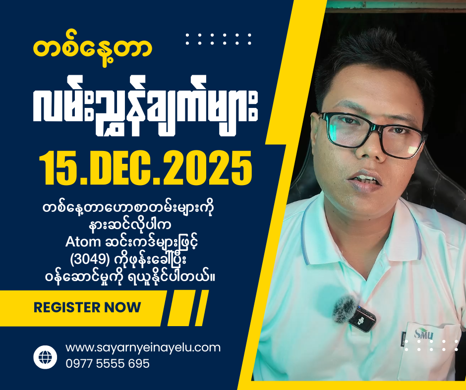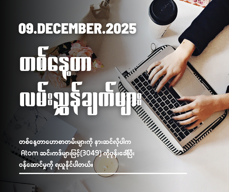 ATOM ဆင်းကဒ်များဖြင့် (3049) ကို ဖုန်းခေါ်ဆိုပြီး နားဆင်နိုင်ပါတယ်…။ ( တစ်ပတ်လျှင် ၄၅၀ ကျပ်သာကျသင့် မှာဖြစ်ပါတယ်။)
