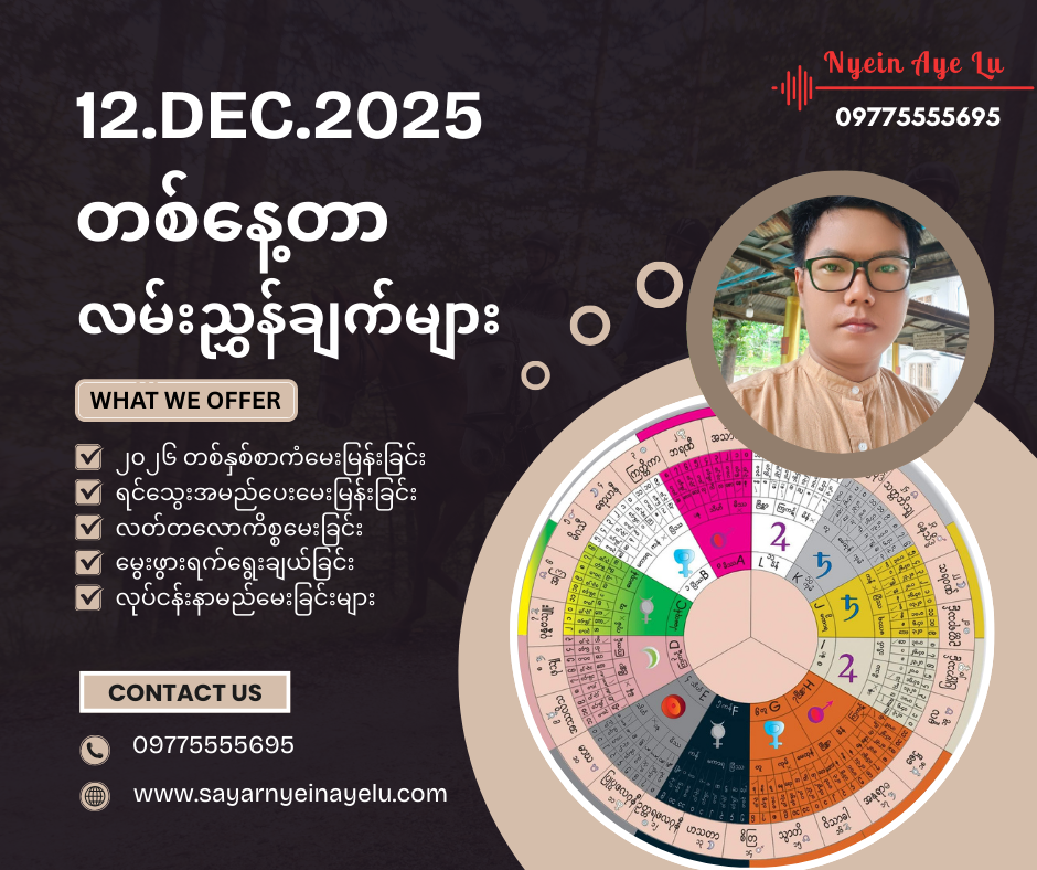 ဒါအပြင်ဆရာငြိမ်းအေးလူနှင့်တိုက်ရိုက်📞ဖုန်းခေါ်ဆိုပြီး ဗေဒင်မေးချင်တယ်ဆိုရင်…အပတ်စဥ် တနင်္လာနေ့၊အင်္ဂါနေ့၊ ဗုဒ္ဓဟူးနေ့ရောက်တိုင်း ညနေ (၆) နာရီကနေ (၈) နာရီအတွင်းဖုန်းနံပါတ် (7777) ကို Atomဖုန်းနံပါတ်များနှင့် ဖုန်းခေါ်ဆိုပြီး မေးမြန်းနိုင်ပါတယ် ခင်ဗျာ… ။ ( တစ်မိနစ်လျှင် ၅၂၅ ကျပ် ၊ ဉာဏ်ပူဇော်ခပါပြီး ကျသင့်ပါမယ်)