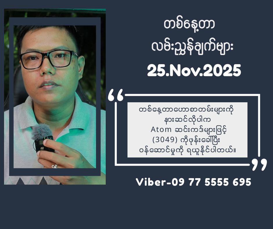 ATOM ဆင်းကဒ်များဖြင့် (3049) ကို ဖုန်းခေါ်ဆိုပြီး နားဆင်နိုင်ပါတယ်…။ ( တစ်ပတ်လျှင် ၄၅၀ ကျပ်သာကျသင့် မှာဖြစ်ပါတယ်။)