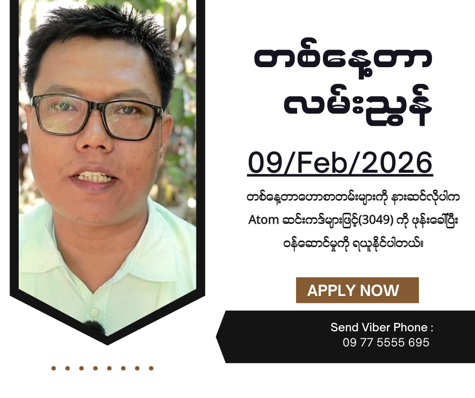 ATOM ဆင်းကဒ်များဖြင့် (3049) ကို ဖုန်းခေါ်ဆိုပြီး နားဆင်နိုင်ပါတယ်…။  ( တစ်ပတ်လျှင် ၄၅၀ ကျပ်သာကျသင့် မှာဖြစ်ပါတယ်။)