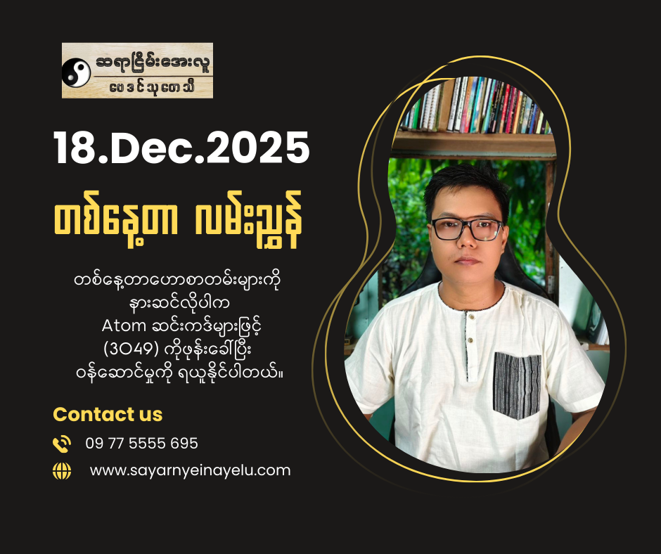 ဒါအပြင်ဆရာငြိမ်းအေးလူနှင့်တိုက်ရိုက်📞ဖုန်းခေါ်ဆိုပြီး ဗေဒင်မေးချင်တယ်ဆိုရင်…အပတ်စဥ် တနင်္လာနေ့၊အင်္ဂါနေ့၊ ဗုဒ္ဓဟူးနေ့ရောက်တိုင်း ညနေ (၆) နာရီကနေ (၈) နာရီအတွင်းဖုန်းနံပါတ် (7777) ကို Atomဖုန်းနံပါတ်များနှင့် ဖုန်းခေါ်ဆိုပြီး မေးမြန်းနိုင်ပါတယ် ခင်ဗျာ… ။ ( တစ်မိနစ်လျှင် ၅၂၅ ကျပ် ၊ ဉာဏ်ပူဇော်ခပါပြီး ကျသင့်ပါမယ်)
