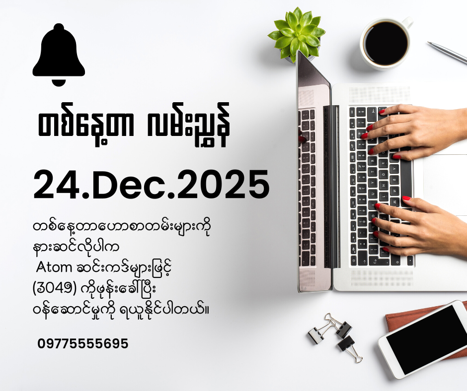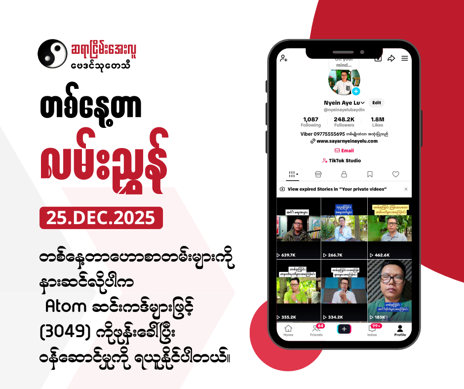 ATOM ဆင်းကဒ်များဖြင့် (3049) ကို ဖုန်းခေါ်ဆိုပြီး နားဆင်နိုင်ပါတယ်…။  ( တစ်ပတ်လျှင် ၄၅၀ ကျပ်သာကျသင့် မှာဖြစ်ပါတယ်။)