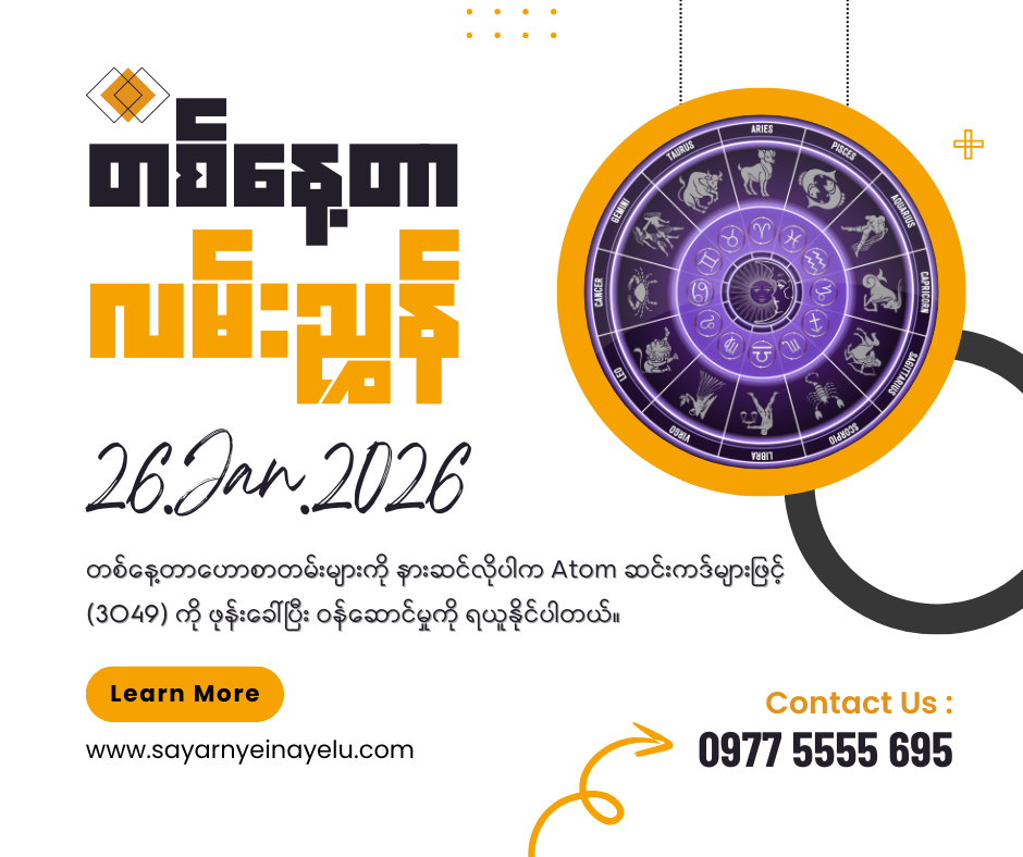ဒါအပြင်ဆရာငြိမ်းအေးလူနှင့်တိုက်ရိုက်📞ဖုန်းခေါ်ဆိုပြီး ဗေဒင်မေးချင်တယ်ဆိုရင်…အပတ်စဥ် တနင်္လာနေ့၊အင်္ဂါနေ့၊ ဗုဒ္ဓဟူးနေ့ရောက်တိုင်း ညနေ (၆) နာရီကနေ (၈) နာရီအတွင်းဖုန်းနံပါတ် (7777) ကို Atomဖုန်းနံပါတ်များနှင့် ဖုန်းခေါ်ဆိုပြီး မေးမြန်းနိုင်ပါတယ် ခင်ဗျာ… ။ ( တစ်မိနစ်လျှင် ၅၂၅ ကျပ် ၊ ဉာဏ်ပူဇော်ခပါပြီး ကျသင့်ပါမယ်)